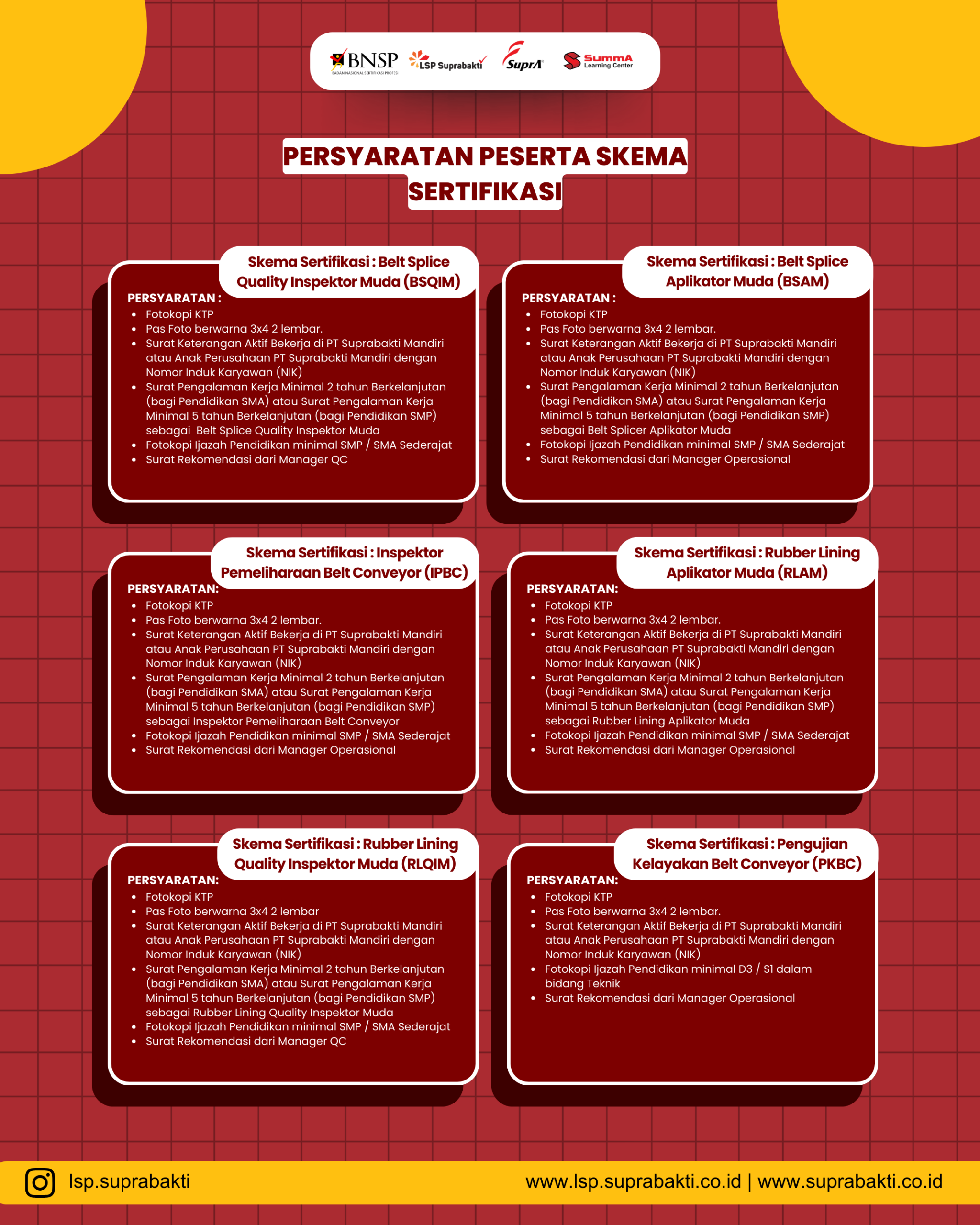 - Surat Pengalaman Kerja Minimal 2 tahun Berkelanjutan (bagi Pendidikan SMA) atau Surat Pengalaman Kerja Minimal 5 tahun Berkelanjutan (bagi Pendidikan SMP) sebagai Inspektor Pemeliharaan Belt Conveyor